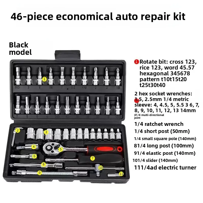 • 10/46/53 قطعة مجموعة أدوات إصلاح السيارات:تشتمل هذه المجموعة على 46 أداة أساسية لإصلاح السيارات، مما يجعلها حلاً شاملاً لجميع احتياجات سياراتك.